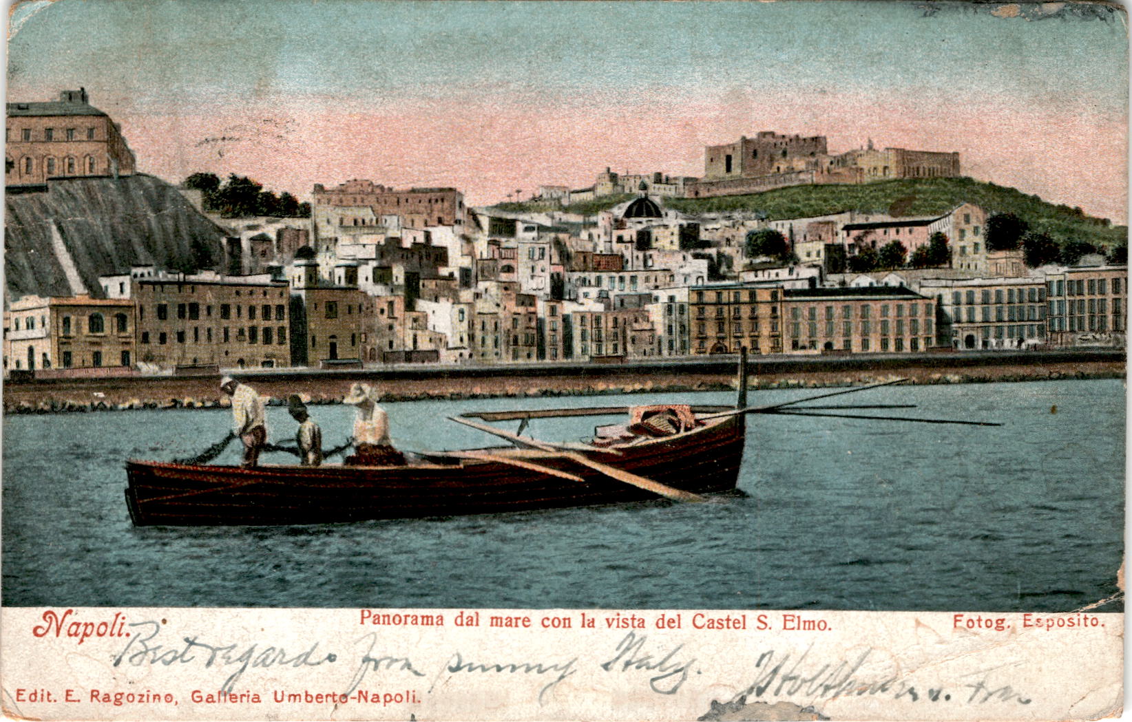 Back of PostcardThe postcard features a panoramic view of Napoli from the sea, showcasing the Castel S. Elmo. The front of the postcard is edited by E. Ragozino and photographed by Esposito. It is from Italy and has a stamp with the number 4.2793.