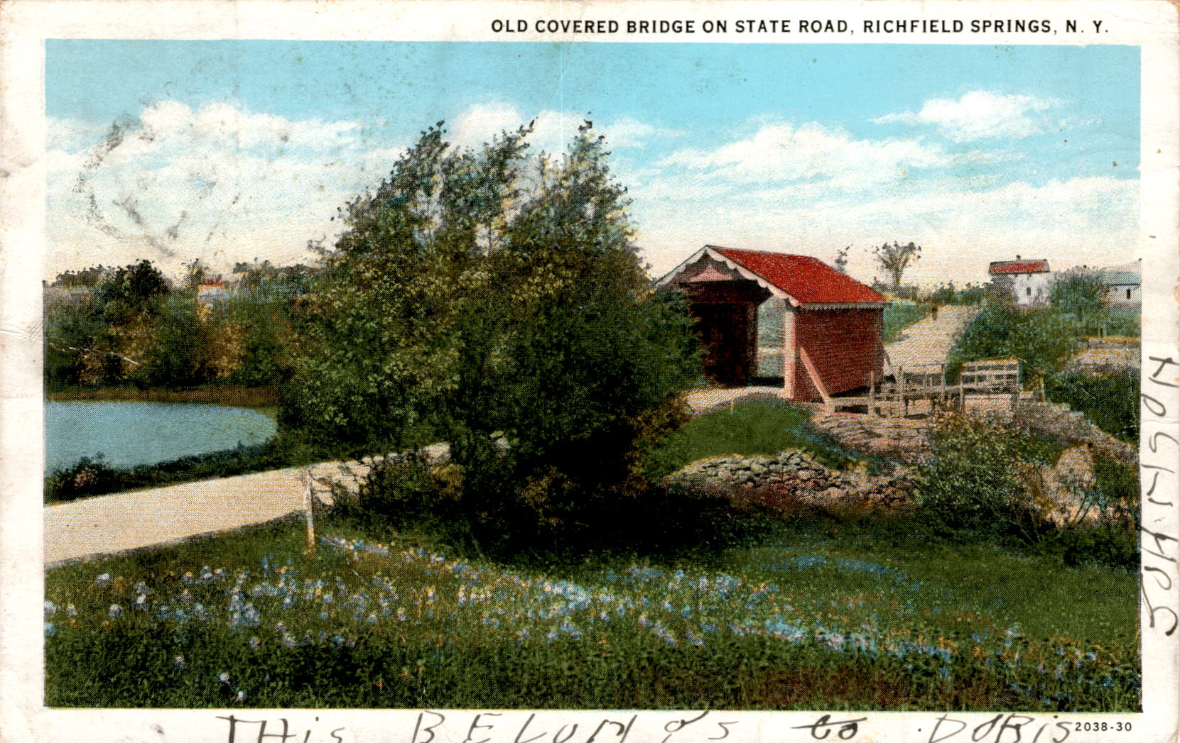 The postcard features an image of an old covered bridge on State Road in Richfield Springs, New York. The front of the postcard includes a handwritten note addressed to Doris, mentioning a ride taken by the sender and their father under the bridge. The postcard is published by M. Tuller & Son in Richfield Springs.