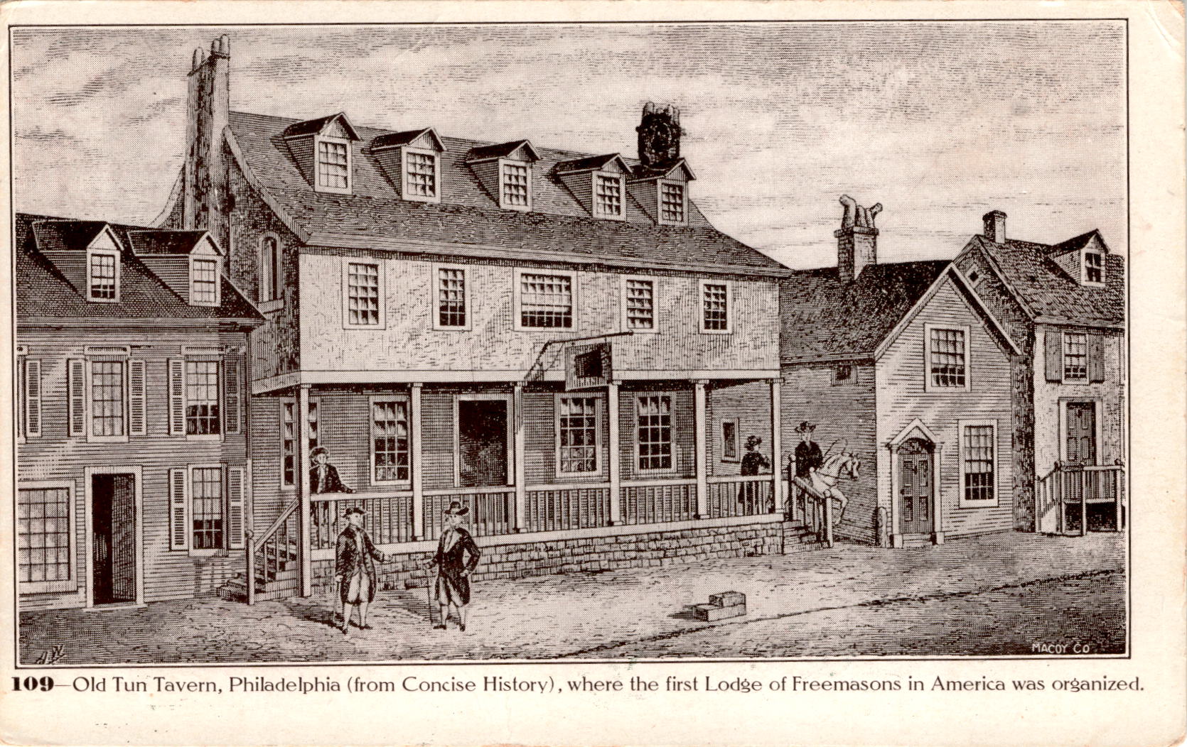 The postcard mentions Macoy Co, located at 109 Old Tun Tavern in Philadelphia, where the first Lodge of Freemasons in America was organized. Macoy Publishing and Masonic Supply Company, based in New York City, is also noted on the postcard, offering emblematic postcards and other society specialties.