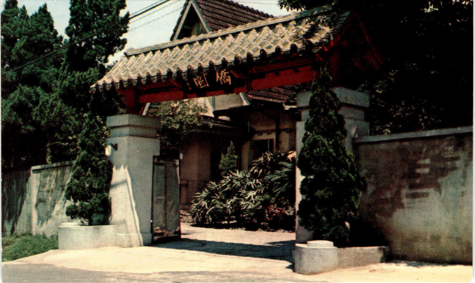 The postcard features a picture of the Front Gate of Overseas Chinese House in Peitou, Taiwan. Peitou is a district in Taipei City known for its hot springs and natural scenery. The Overseas Chinese House is a historic building that serves as a cultural center for overseas Chinese.
