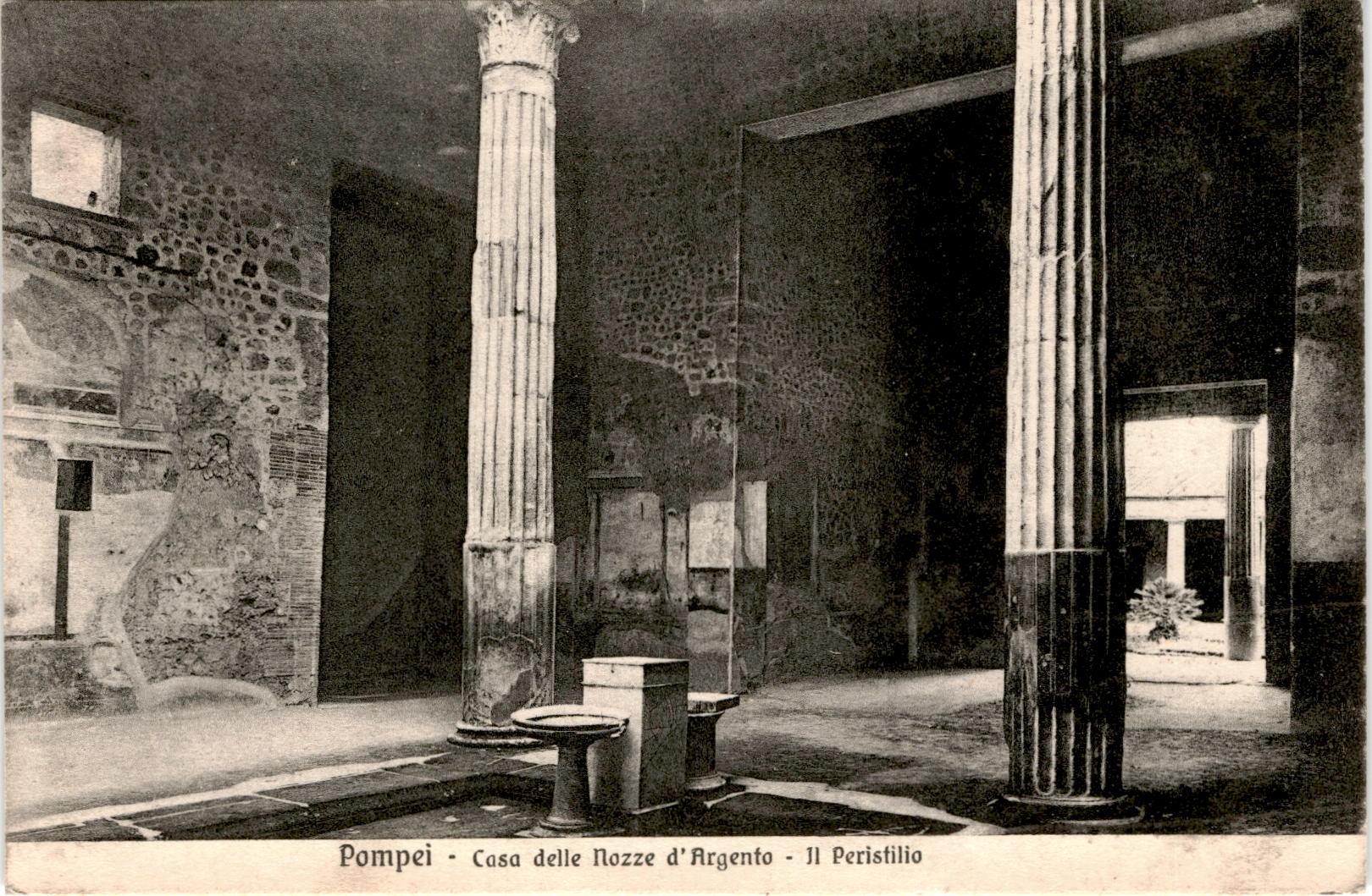 The postcard describes the Casa delle Nozze d’Argento in Pompeii, Italy, specifically highlighting the Peristilio area. The sender mentions the interiors and the current state of preservation, noting the strong, crude colors of the frescoes with Pompeian red being prominent. The postcard is addressed to Edward Watson in the U.S.A, South Carolina.