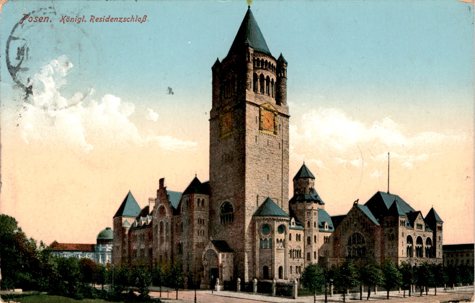 The postcard is a view of the Königl. Residenzschloß in Posen, likely from August 19, 1912. The writer comments that the castle is not as pretty as it appears, and the area seems dead to them, but the people seem to have a fondness for a Miss Annie Manly.