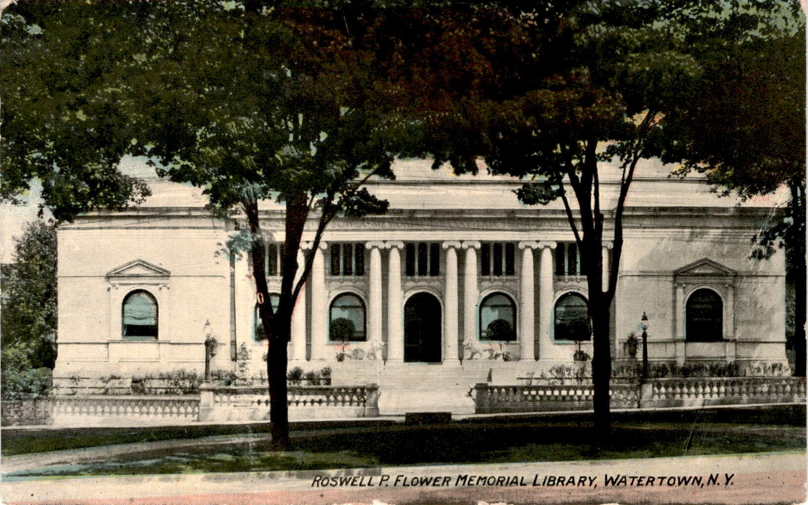 The postcard is a message from someone named Miss Ariel Savage to someone else. It mentions receiving a letter from Miss Bayler Feind and plans to return in 10 days from a short trip to a chorus country for 5 days.The postcard is from the Roswell P. Flower Memorial Library in Watertown, New York. Roswell P.