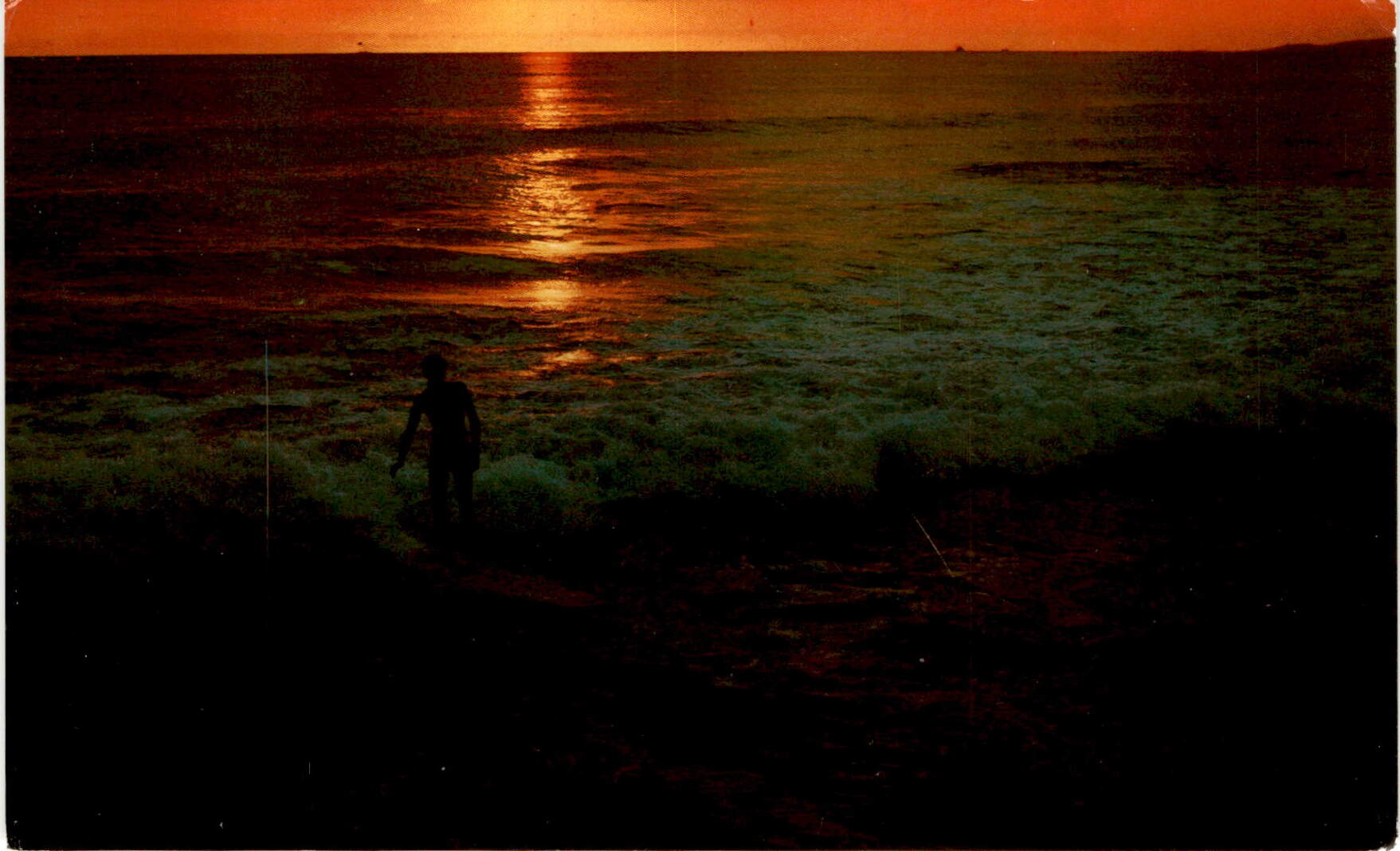 The postcard depicts surfing on the ocean at sunset. The address on the postcard is for Hakubundo Book Company located on Smith Street in Honolulu, Hawaii. The postcard was made in Japan. The front of the postcard has a space for a stamp and the back has space for an address.