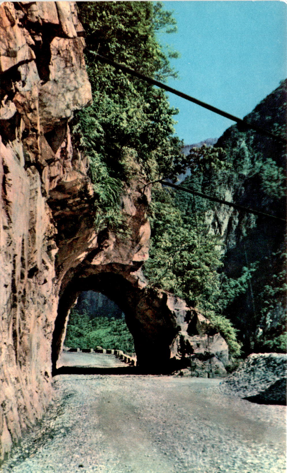 The postcard is featuring Taroko Gorge in Taiwan. Taroko Gorge is a popular tourist destination known for its stunning natural beauty, including marble cliffs, deep valleys, and rushing rivers. The gorge is located within Taroko National Park, which is one of the nine national parks in Taiwan.