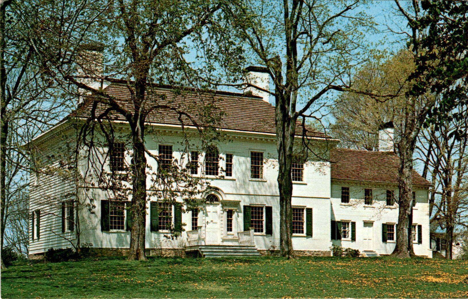 The postcard describes Washington’s Headquarters at Morristown National Historical Park in New Jersey, where General and Mrs. Washington lived from December 1779 to June 1780. The mansion was built in 1772-1774 by Col. Jacob Ford Jr. and now houses a historical museum with Revolutionary War artifacts.