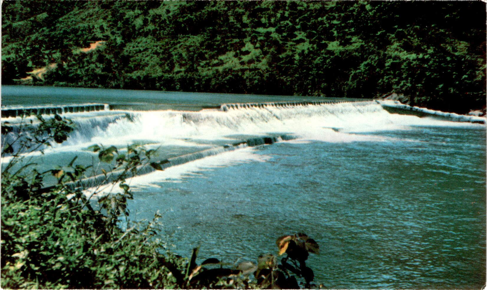 The postcard features a picture of the Wulai Dam in Taiwan. Wulai Dam is located in the Wulai District of New Taipei City, Taiwan. It is a concrete gravity dam built on the Nanshi River. The dam serves multiple purposes, including flood control, water supply, and hydroelectric power generation.
