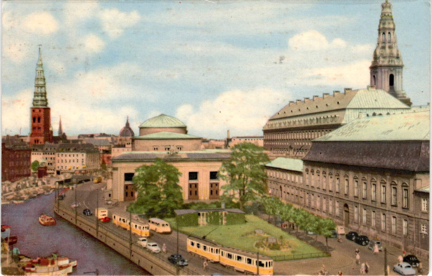 The postcard features a picture of Thorvaldsens Museum in Copenhagen, Denmark. The museum is dedicated to the works of Danish neoclassical sculptor Bertel Thorvaldsen. It is located in central Copenhagen and houses a large collection of his sculptures, as well as his personal collection of art, antiques, and artifacts.