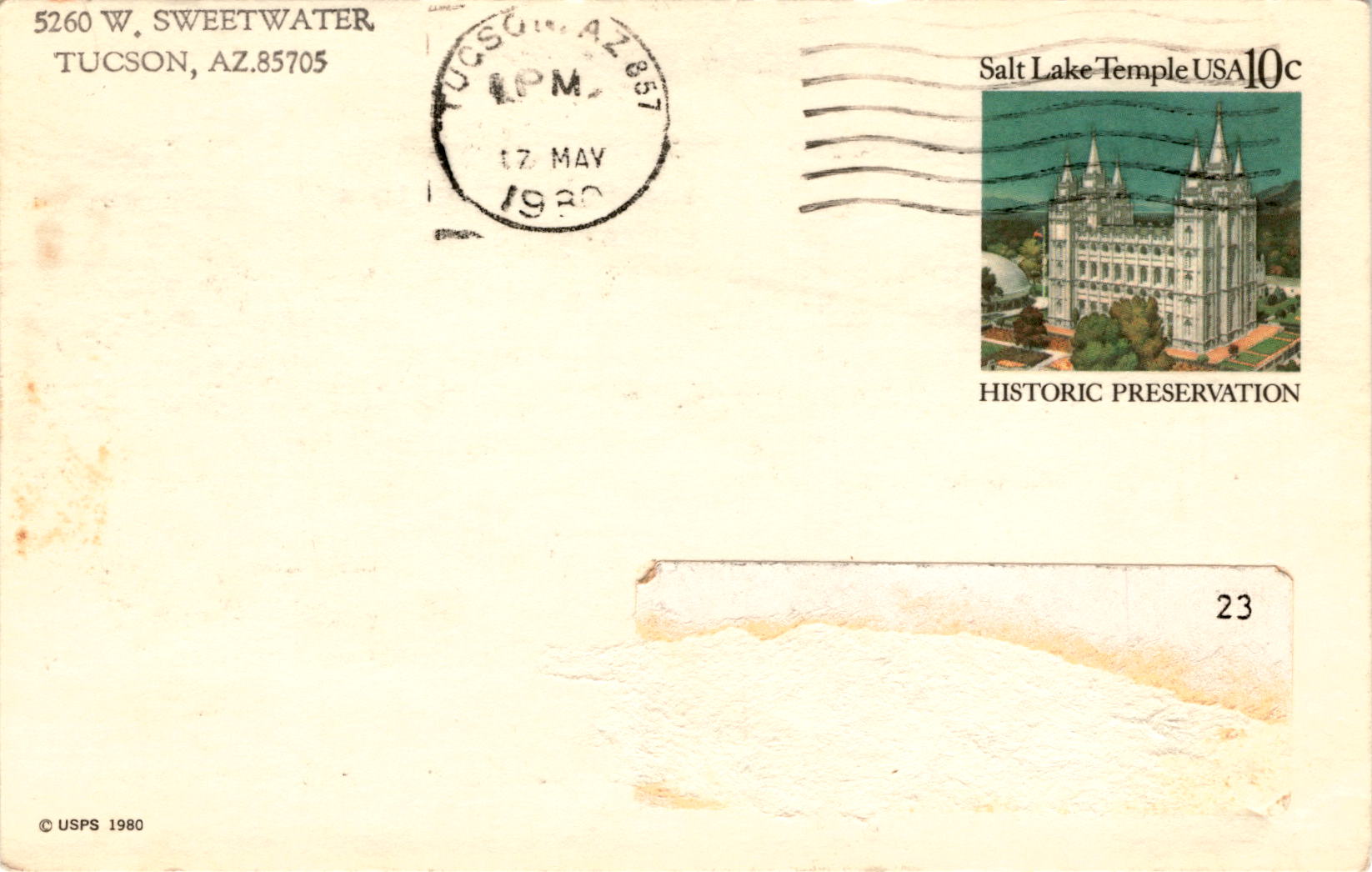 The postcard is from the Tucson Stamp Club, discussing upcoming events and meetings. The postcard includes the address of the club, meeting dates, and activities. It mentions a presentation on the Psychological Effects of Stamp Collecting by Dr.