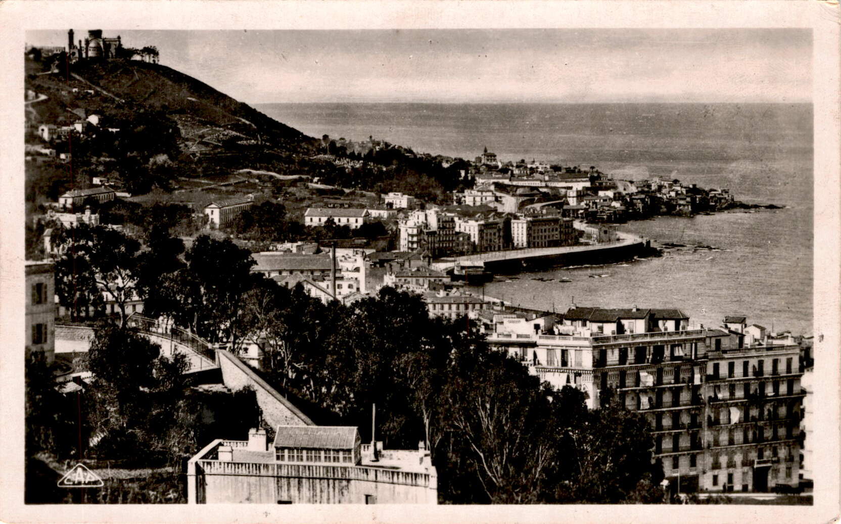 The postcard features a view of Bab-El-Oued and Notre-Dame d’Afrique in Algiers. The image is a Real-Photo by C. A. P. Strasbourg.- Bab El Oued is a neighborhood in Algiers, the capital city of Algeria. It is known for its picturesque setting along the Mediterranean Sea.