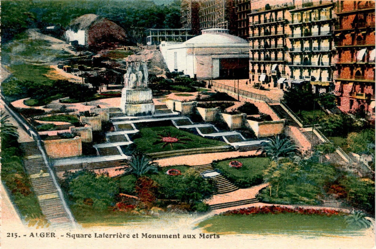 The postcard features a photograph of Square Laferrière and the Monument aux Morts in Algiers, Algeria. The image was produced by the Photo Albert establishment located on 5 Rue Rochambeau in Algiers.- **Algiers**: Algiers is the capital city of Algeria, located on the Mediterranean coast.