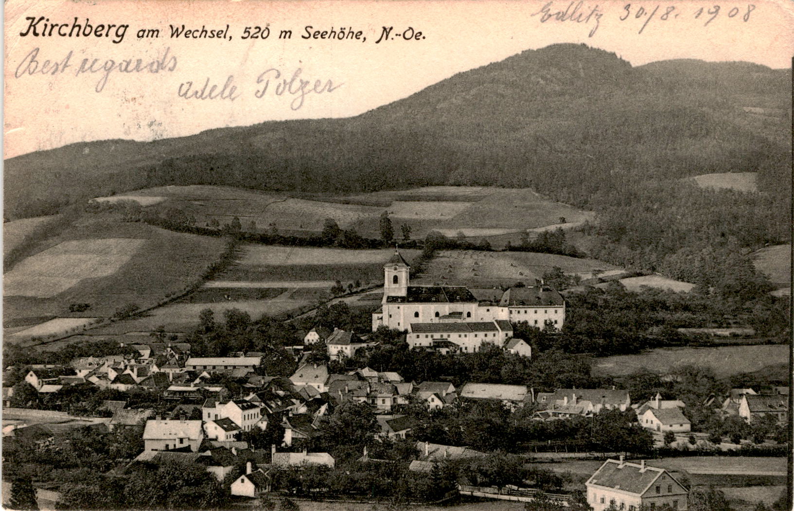 The postcard is dated August 30, 1908, from am Wechsel, which is located at an altitude of 520 meters in Lower Austria. The sender, Adele Polger, mentions being in Kirchberg and sends best regards to Toldi Wile and Halene Vele.