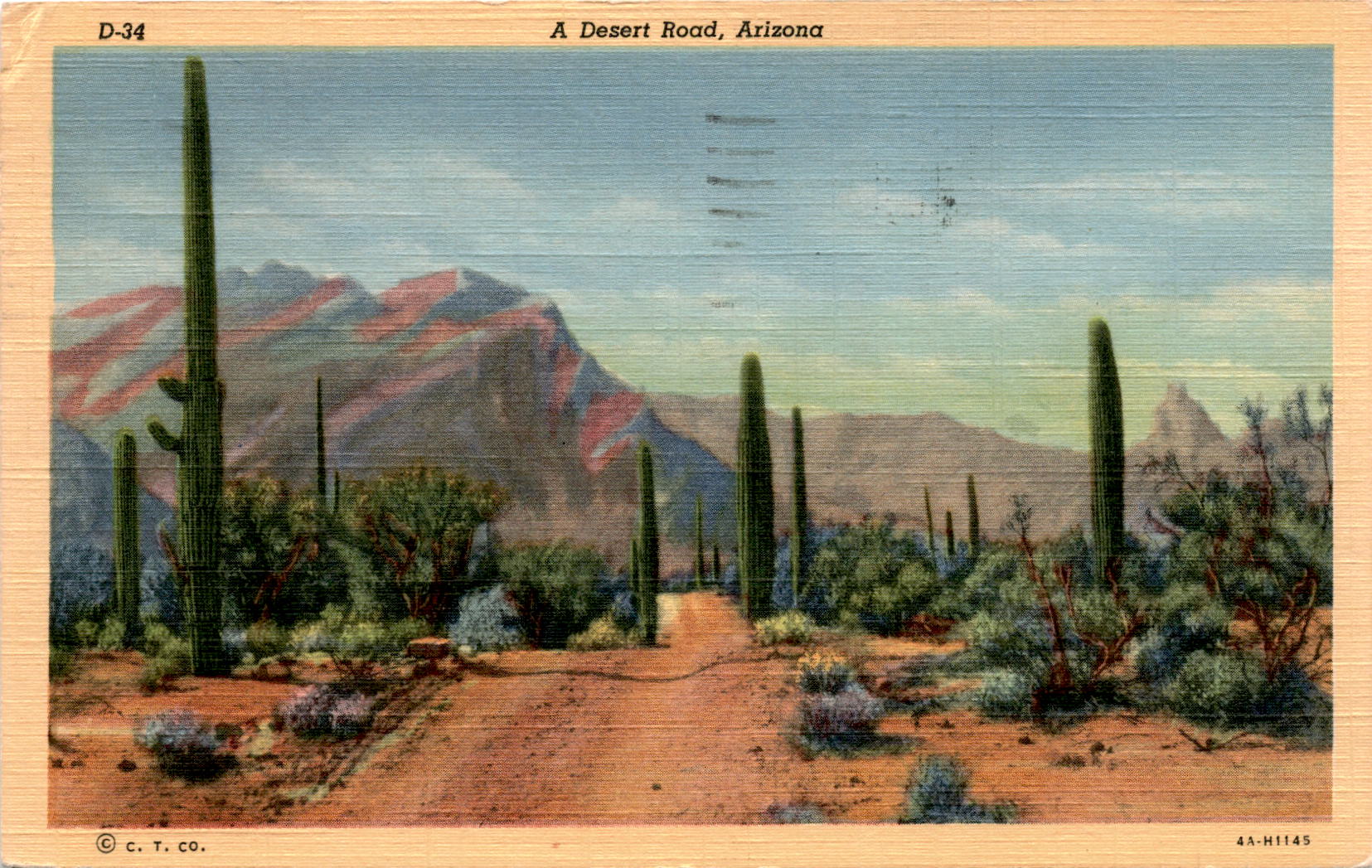 Back of PostcardThe postcard is a vintage image of a desert road in Arizona, specifically marked as D-34. It is distributed by CC. T. Co. and features a scene from the Tucson Indian Training School collection. The recipient of the postcard is Miss Beatrice Melcher, addressed at 56 Pine St., New York, N.Y.