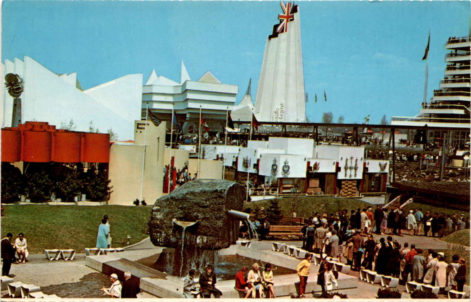 This postcard is from the Ava Expo 67, which took place in 1967. The postcard features the Asbestos Plaza, showcasing a fountain sculptured from a large green rock of asbestos ore. The pavilions of Monaco and Haiti are situated adjacent to this plaza.