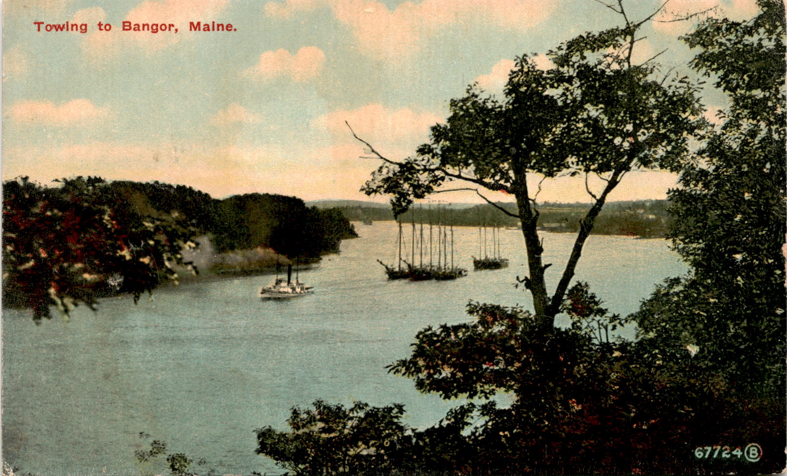 The postcard is a souvenir from Bangor, Maine, featuring a towing scene. It was published by O. Crosby Bean, who operated a souvenir goods business in Bangor. The front of the postcard shows the image of a towing operation, possibly a significant activity in the area.