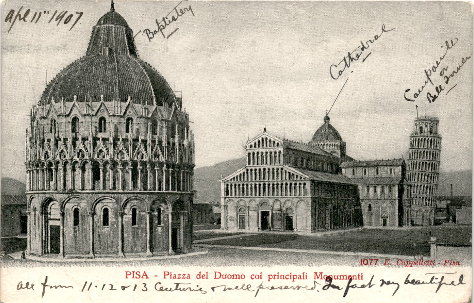 Back of PostcardThis postcard features a view of Pisa, Italy, showcasing the Baptistry, Cathedral, Campanile (bell tower), and Bell Innen (inner bell tower). The image captures the Piazza del Duomo with its main monuments dating back to the 11th to 13th centuries, all well-preserved.