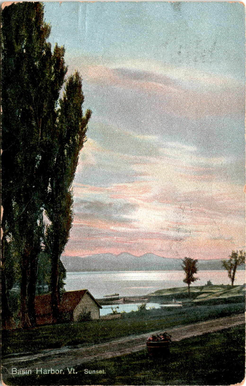 The postcard features a picture of a sunset at Basin Harbor, Vermont, and is manufactured by THE HUGH C. LEIGHTON CO. in Portland, Maine. The postcard includes a message to Hallie, discussing travel plans and staying at Wallingford and Tuxis Island. The postcard is dated 1904 and has a one-cent U.S.