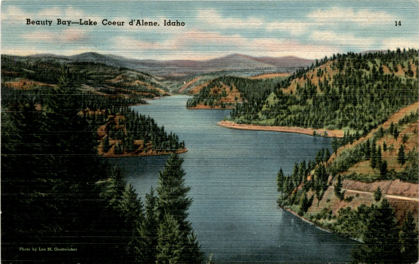 The postcard features a photo of Beauty Bay on Lake Coeur d’Alene in Idaho, taken by Leo M. Oestreicher. Lake Coeur d’Alene is known for its vastness, with 103 miles of shoreline and a length of 22 miles. Visitors often praise the beauty and delights of the lake.