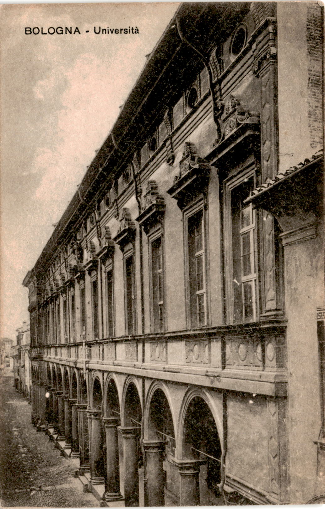 The postcard is from Bologna, Italy, sent by C.A. Tumel on October 19, 1922, to the University of Arizona in Tucson, Arizona. The front of the postcard features a view of the Università building. The sender mentions being in Italy and enjoying a short stop in Bologna.