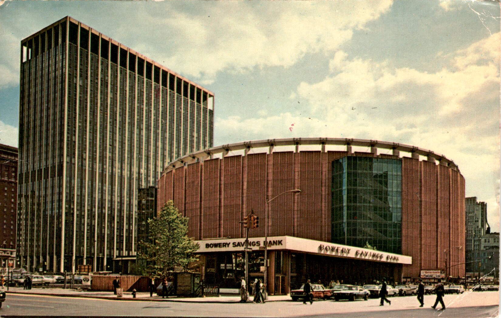 The postcard mentions the Bowery Savings Bank, Madison Square Garden Center, Pennsylvania Plaza, and the United Nations. The Bowery Savings Bank was a historic bank located in New York City, known for its impressive architecture and long history of serving the community. Madison Square Garden Center is a famous entertainment venue in New York City, hosting concerts, sports events, and other performances.
