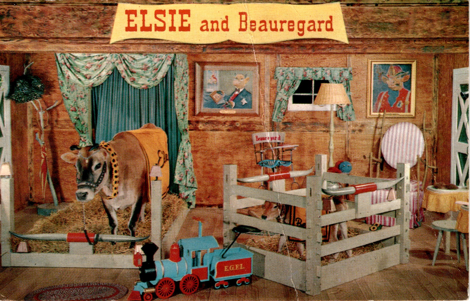 This postcard describes the unique setup of Elsie and Beauregard, who are traveling representatives of Borden’s family of fine foods. Elsie is depicted in her chintz canopied bed, while Beauregard is in his playpen corral.