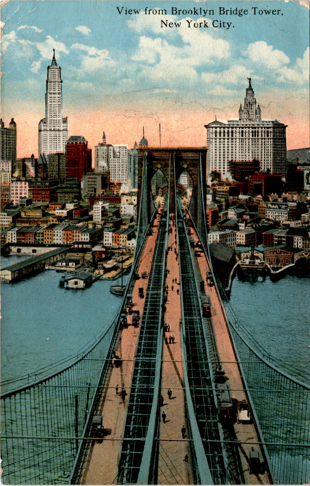 The postcard features a view from the Brooklyn Bridge Tower in New York City, showcasing Lower Manhattan and some of the tallest buildings in the world at the time. The buildings mentioned include the New Woolworth Building, the Municipal Building, and the Singer Building. The Brooklyn Bridge Tower, where the view was captured, is noted to be 400 feet above the water line.