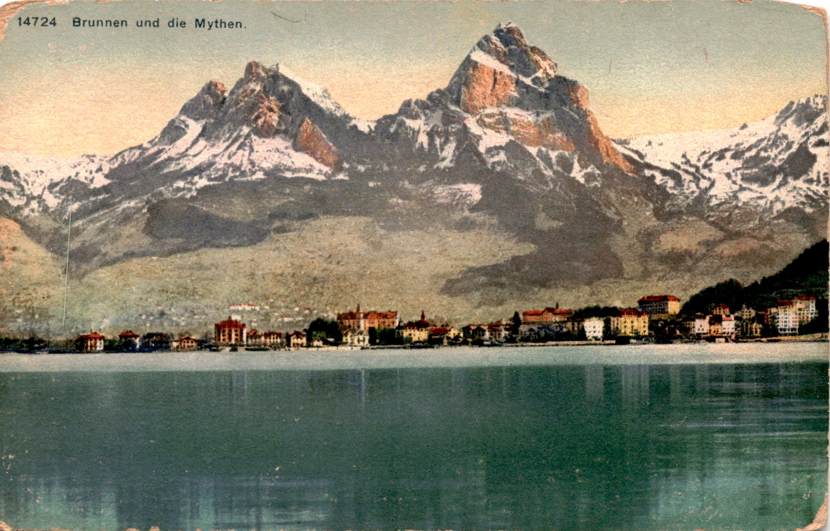 The postcard depicts a view of Brunnen and the Mythen mountains. Brunnen is a town located on the shores of Lake Lucerne in Switzerland, known for its picturesque waterfront promenade and views of the surrounding mountains. The Mythen mountains are a famous mountain range in the Schwyz Alps, near the town of Schwyz in central Switzerland.