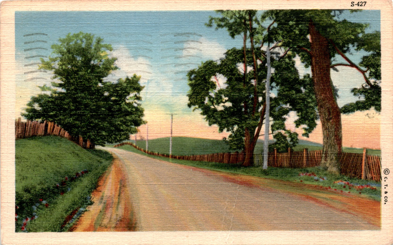 Back of PostcardThe postcard features a collection of country scenes with ten different subjects. It mentions Uncle George and possibly a place called Kelmar. The sender comments on the appearance of the roads and expresses thanks for a pen. The postcard is a genuine Curteich-Chicago C.T. Art-Colortone postcard.
