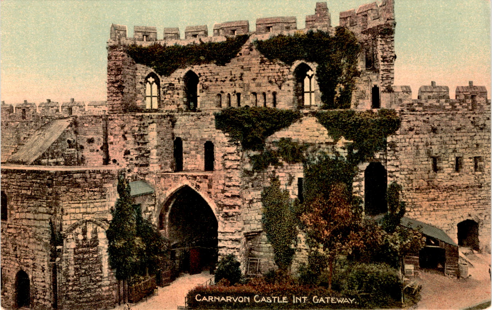 Back of PostcardThe postcard features an image of the interior gateway of Carnarvon Castle. Carnarvon Castle is a medieval fortress located in Gwynedd, Wales. It was built by King Edward I during his conquest of Wales in the 13th century. The castle is known for its distinctive polygonal towers and its imposing presence.