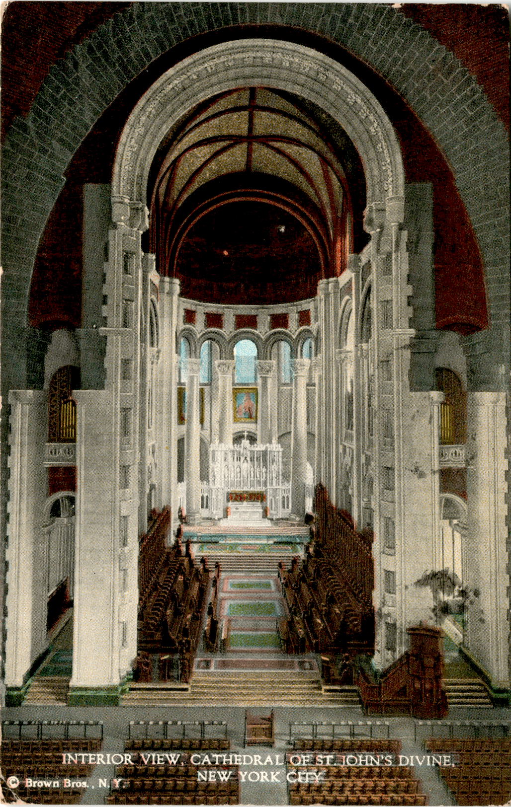 The postcard features an interior view of the Cathedral of St. John the Divine in New York City, showcasing the grand architecture of the church. The Cathedral of St. John the Divine is located between 110th and 113th Streets, overlooking Morningside Park.