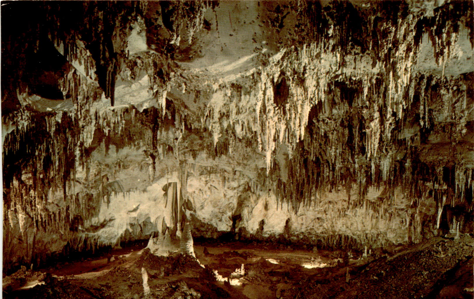 The postcard is from The Cavern Supply Company, Inc. in Carlsbad, New Mexico, showcasing the Papoose Room in Carlsbad Caverns National Park. The Papoose Room is the smallest of the four scenic rooms in Carlsbad Caverns and is entered through a tunnel cut through solid rock from the Queen’s Chamber.
