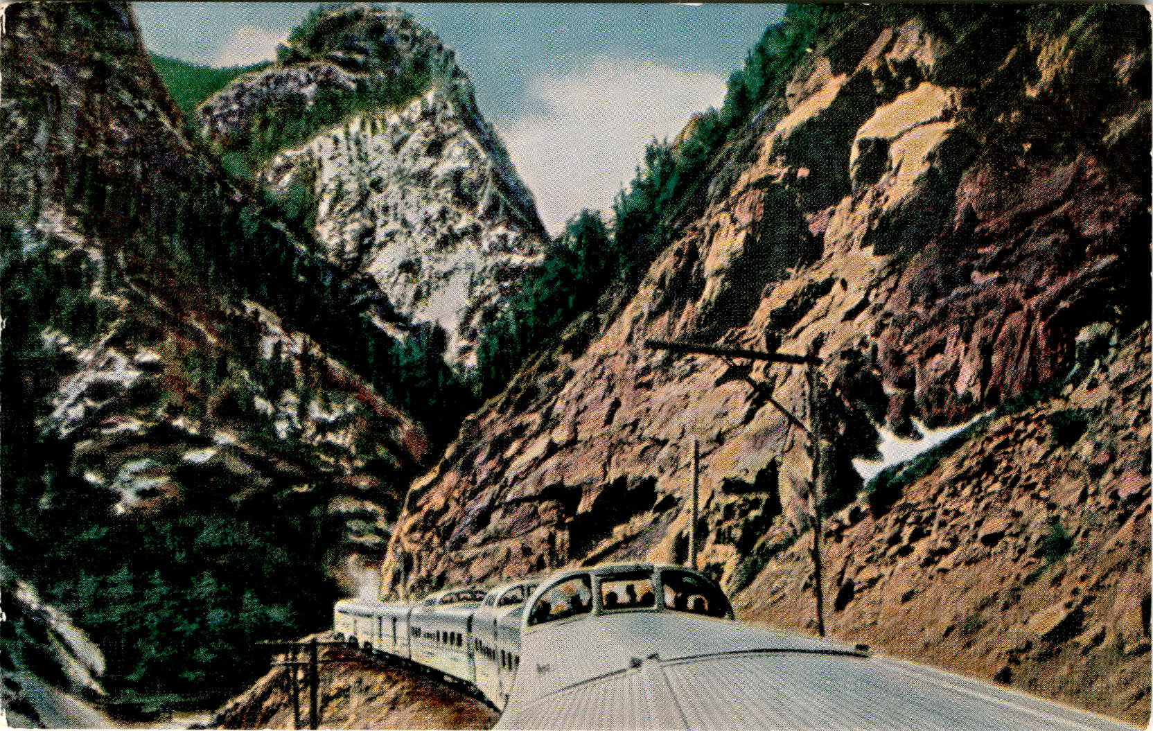 The postcard describes the California Zephyr, a diesel-powered train that runs daily between Chicago, Denver, Salt Lake City, and San Francisco. It highlights the train’s unique feature of five Vista-Dome cars, offering passengers thrilling panoramic views of the passing scenery.