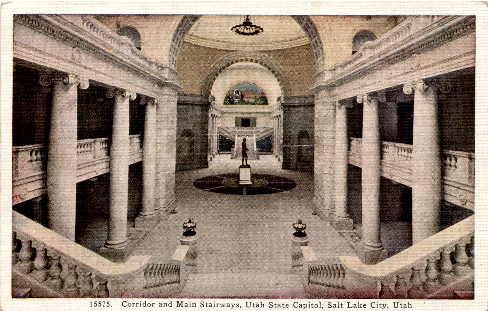 This postcard features an image of the interior of the Utah State Capitol in Salt Lake City, Utah. The Capitol building is known for its impressive architecture, including its corridors, main stairways, dome, and galleries. The postcard was published by Carpenter Paper Co. in Salt Lake City.