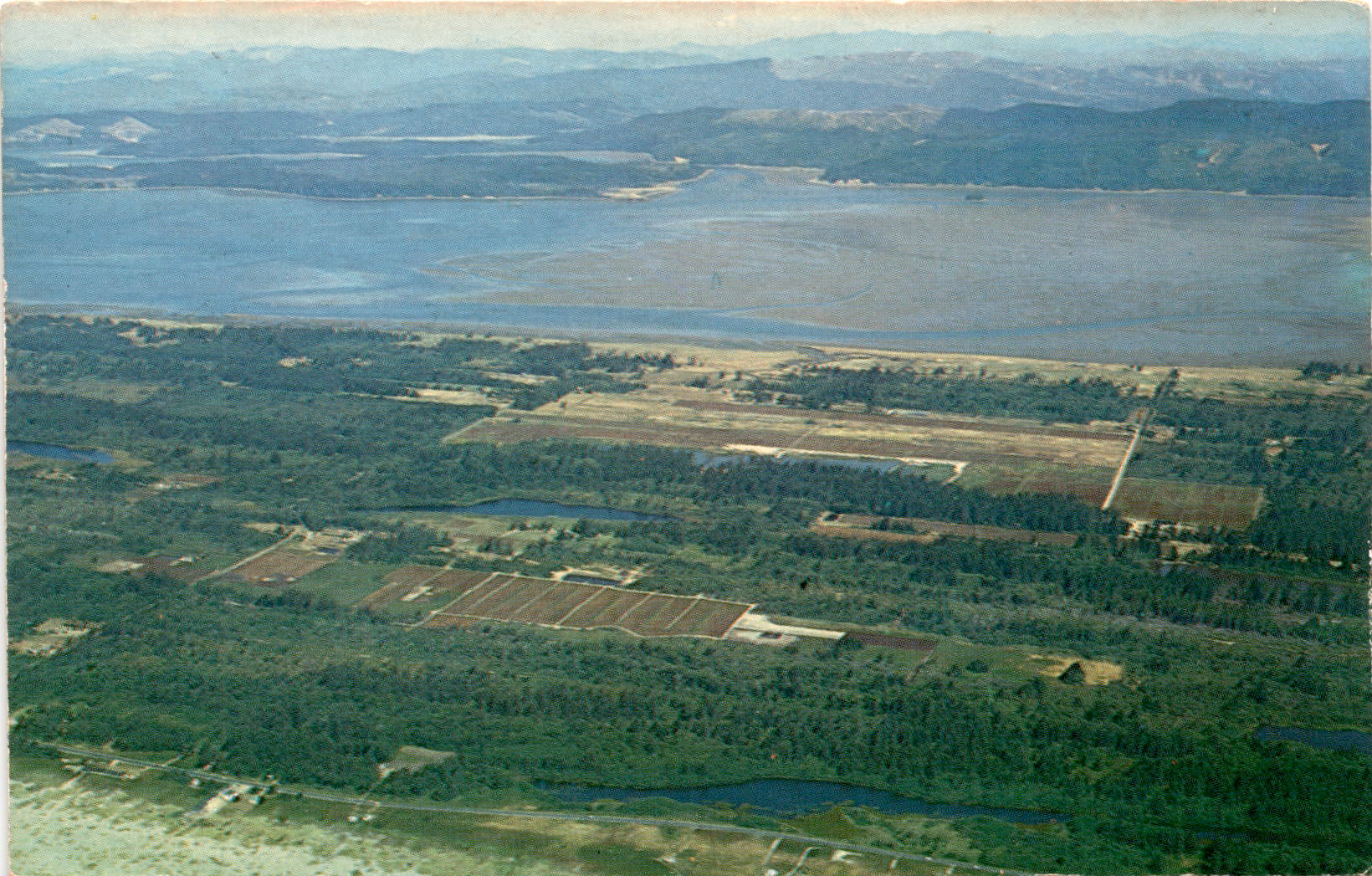 Back of PostcardThis postcard features an aerial view of cranberry bogs, highlighting the production of cranberries along the west coast of Washington. Cranberry bogs are cultivated wetlands where cranberries are grown. The Long Beach region in Washington is specifically noted for its high productivity in cranberry cultivation.