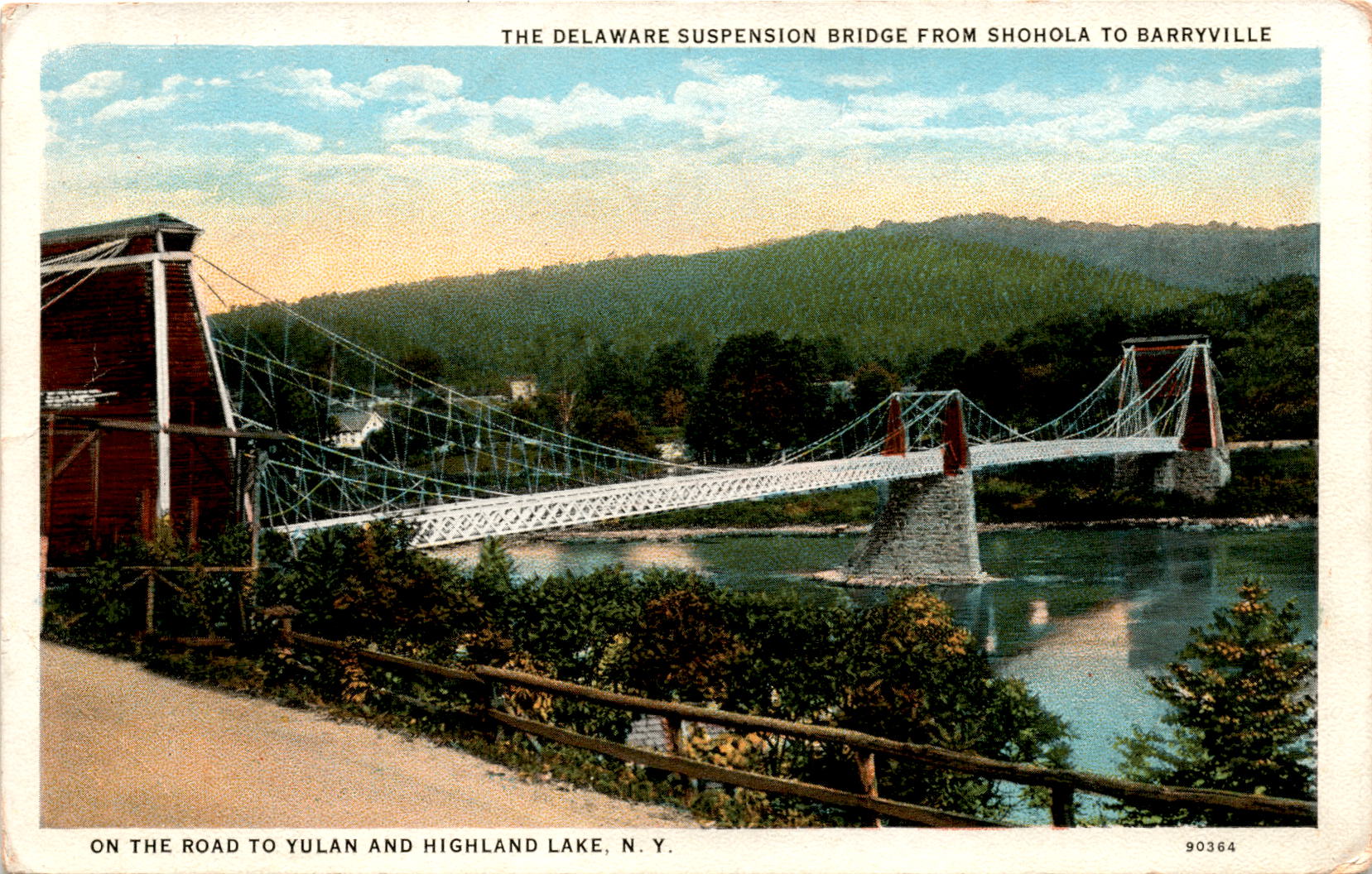 This postcard features the Delaware Suspension Bridge, which connects Shohola, Pennsylvania, to Barryville, New York. The bridge is located on the road to Yulan and Highland Lake, New York. It is a scenic and historic bridge that spans the Delaware River.