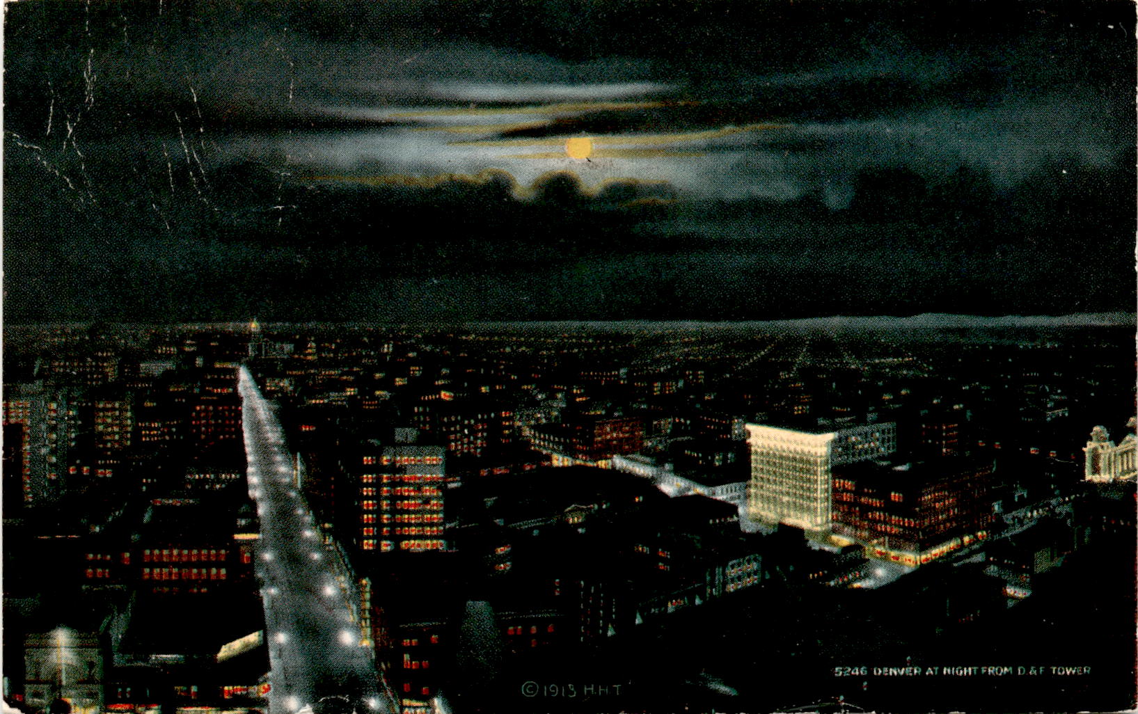 The postcard is a vintage image of Denver at night, taken from the D.&F Tower. The message on the card is a personal note from someone to Mrs. H.A. Pritchard in Sumner, Nebraska. The sender mentions starting their journey back home on Monday with Bell and someone named Wilk, expecting the trip to take about 36 hours.