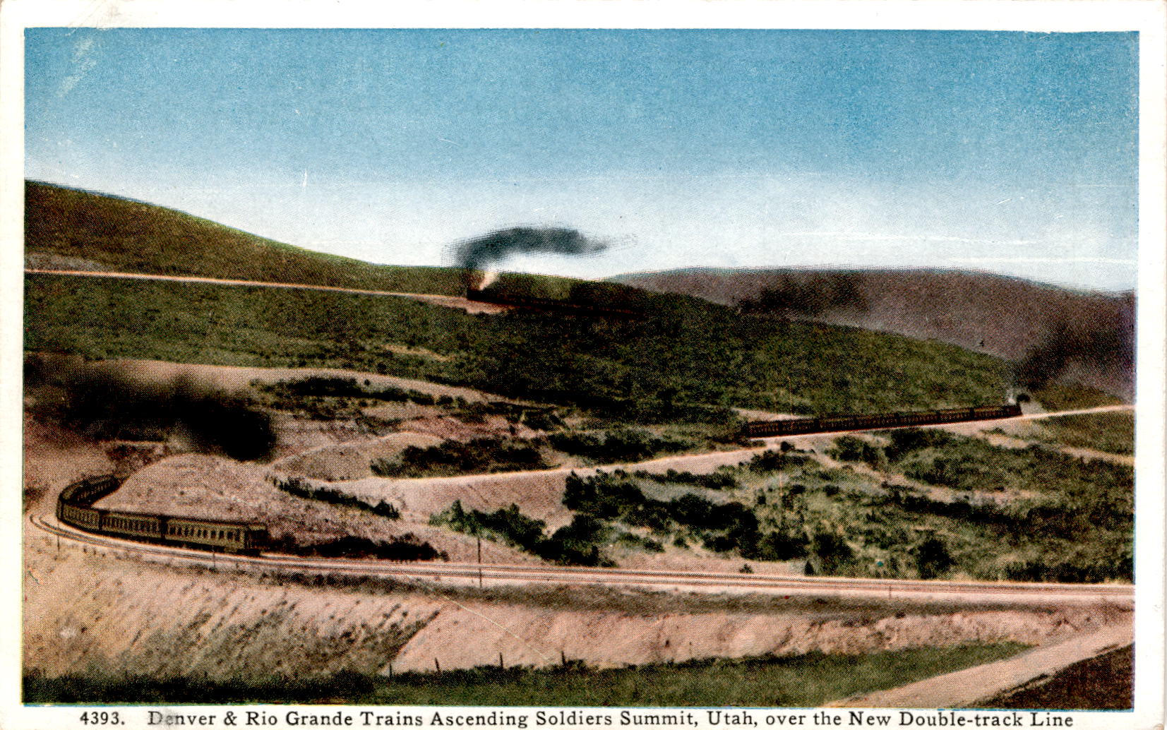 The postcard features a scene of Denver & Rio Grande trains ascending Soldiers Summit in Utah over the new double-track line. Soldiers Summit is the highest railroad point on the Wasatch Range, with an elevation of 7,454 feet. The area is known for its good pasturage, where cattle, horses, and sheep graze among the sagebrush.