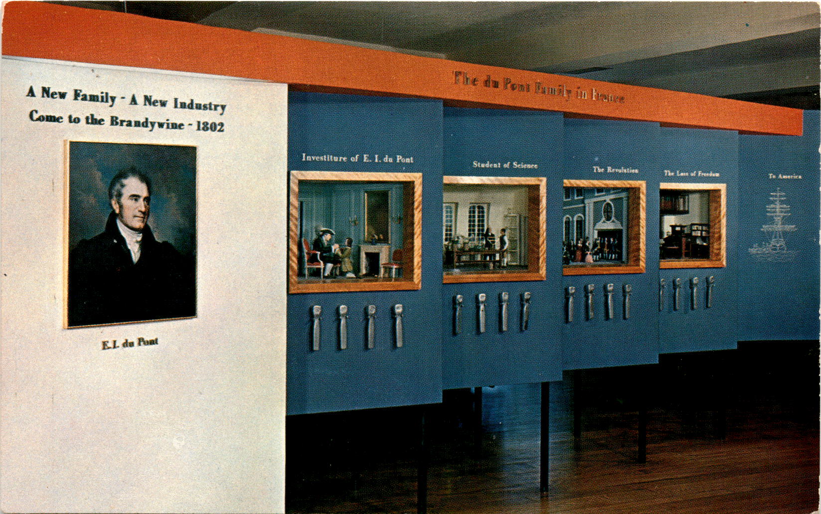 The front of the postcard mentions the du Pont Family and their establishment of a black powder manufactory on the Brandywine in 1802. This historical event marks the beginning of a new industry in the area. E.I.