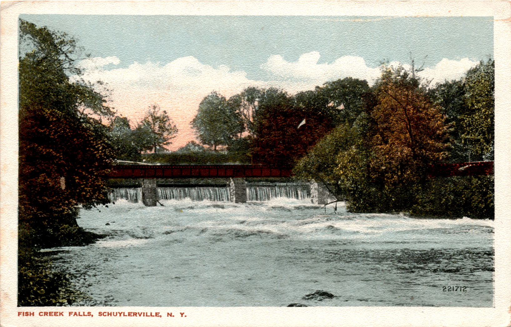 The postcard features a scenic view of Fish Creek Falls in Schuylerville, New York. Fish Creek Falls is a popular natural attraction known for its picturesque waterfalls and hiking trails. Schuylerville is a historic village located in Saratoga County, New York, known for its role in the American Revolutionary War.