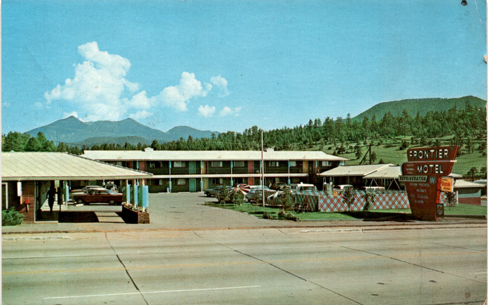 The postcard advertises the Frontier Motel in Flagstaff, Arizona, which is located one mile east of Flagstaff on Highways 66 and 89. The motel offers 31 brand new deluxe units with amenities such as individually controlled heat, tubs and showers, room phones, TV, refrigeration, and a heated swimming pool.