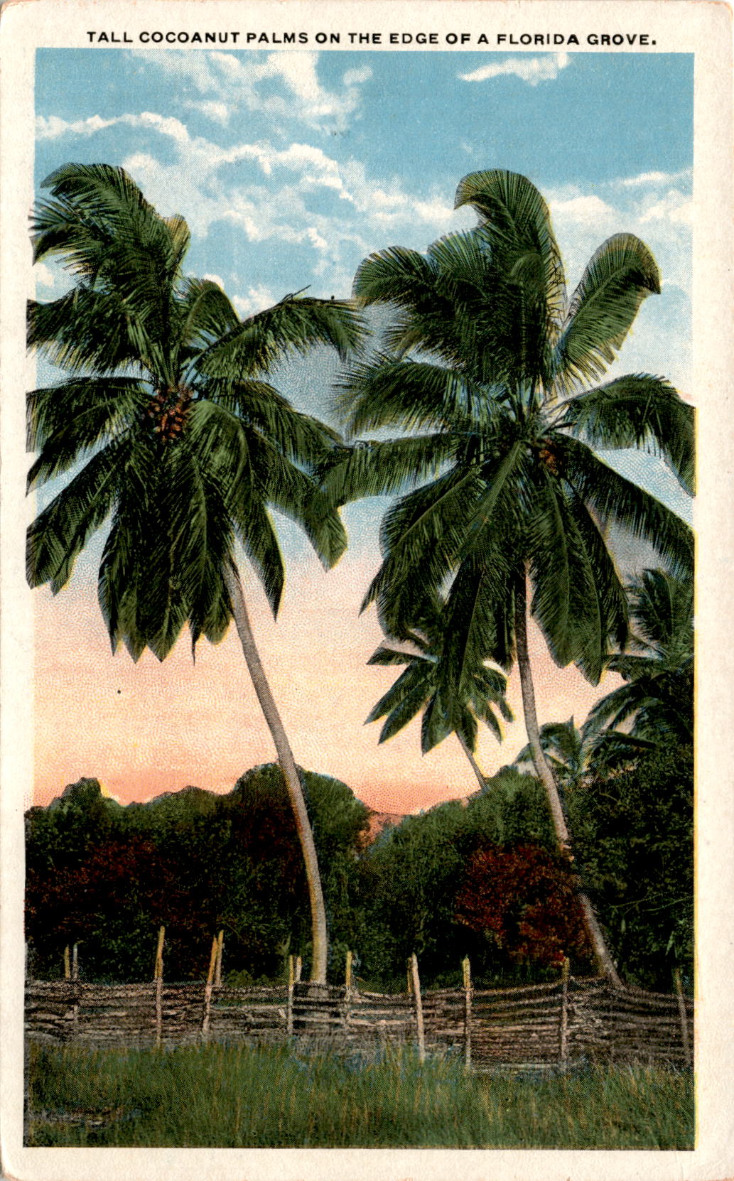 The postcard features tall coconut palms on the edge of a Florida grove. Florida is known for its lush vegetation and tropical climate, making it an ideal location for coconut palms to thrive. These palms are a common sight in Florida, especially in groves where they are cultivated for their fruit and palm leaves.