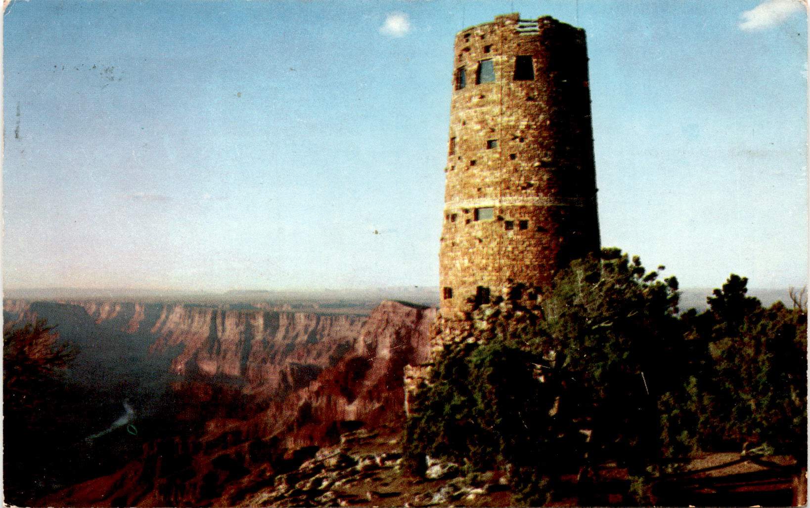 The front of the postcard features a view of the Watchtower at Desert View in Grand Canyon National Park, Arizona. This structure is a recreation of prehistoric Indian lookouts and offers a panoramic view of the Grand Canyon and Painted Desert.