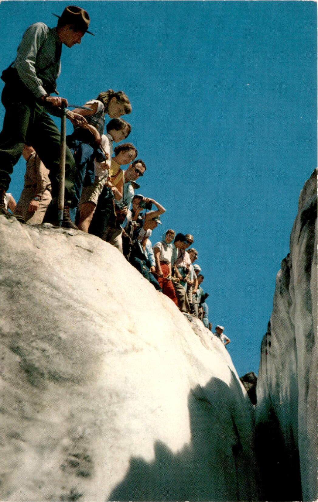 This postcard features a color photo of an ice crevasse on Grinnell Glacier, with a Ranger Naturalist and his party looking down into the bottomless crevasse. The photo was taken by Bob and Ira Spring and published by Glacier Park Company. The postcard was printed by H. S. Crocker Co., Inc.
