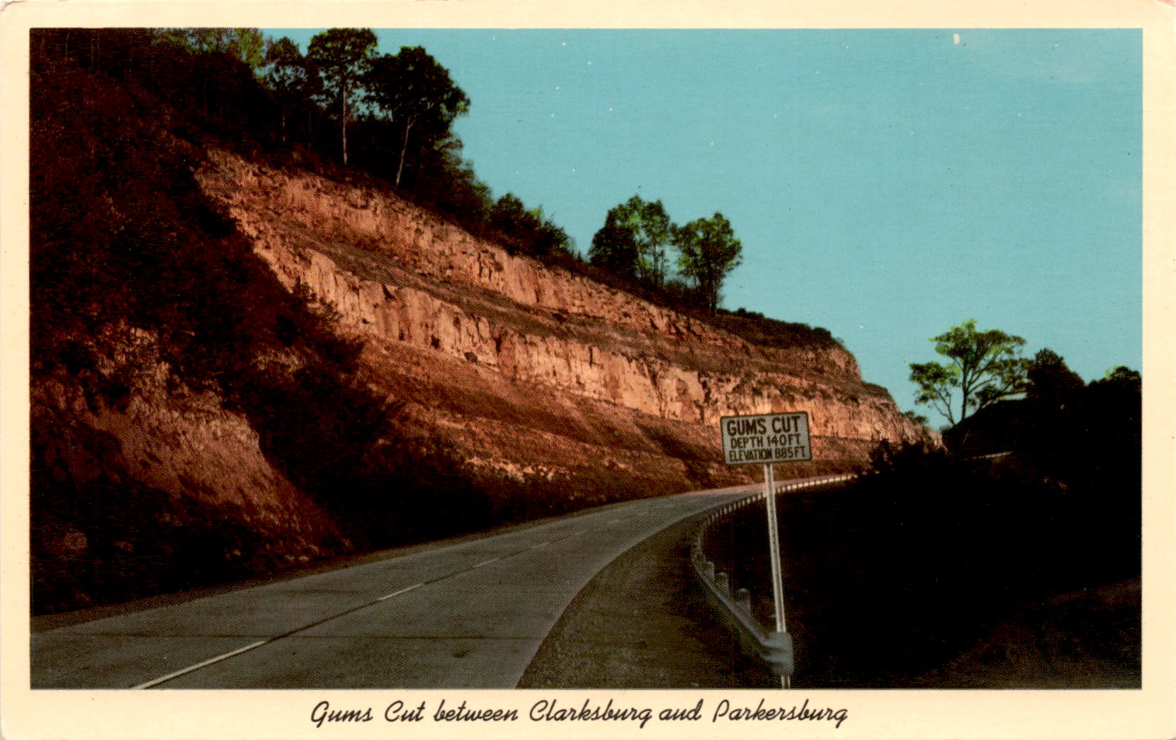 The postcard mentions Gums Cut, a geological formation located between Clarksburg and Parkersburg in West Virginia. The cut is described as being 140 feet deep with an elevation of 885 feet. The postcard features a 3-D natural color reproduction of Gums Cut on U.S. Route 50 in West Virginia.