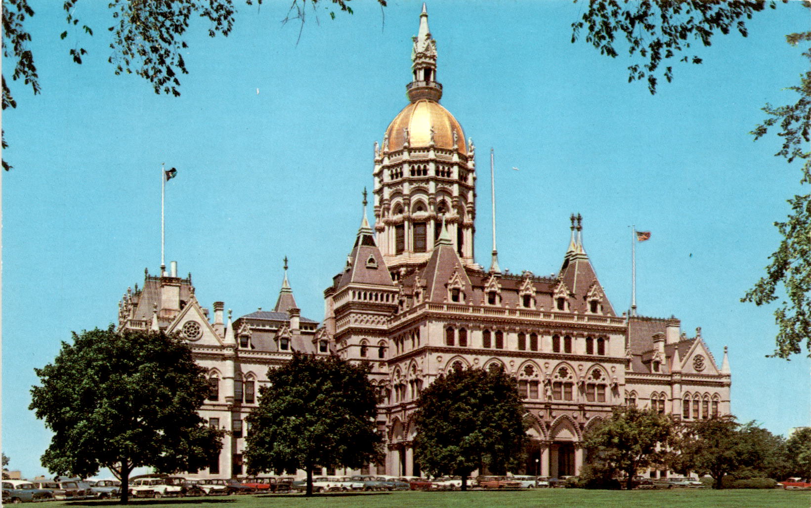 The front of the postcard features a picture of the State Capitol in Hartford, Connecticut, located in Bushnell Park. The Capitol building was constructed in 1877 and is designed in a modified French Gothic style.Hartford is the capital city of Connecticut and is known for its rich history, being one of the oldest cities in the United States.