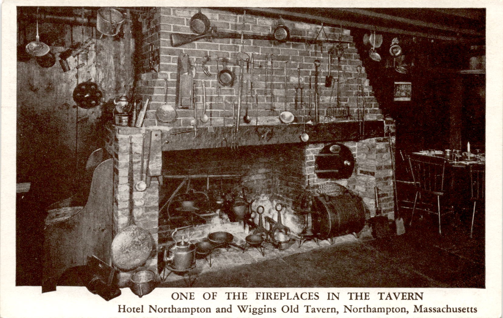 The postcard features a fireplace in Wiggins Old Tavern, located in Northampton, Massachusetts. The tavern is part of the Hotel Northampton. The establishment is known for its colonial charm and historical significance. Lewis N. Wiggins is mentioned as the landlord of the tavern.The Hotel Northampton is a historic hotel located in downtown Northampton, Massachusetts.