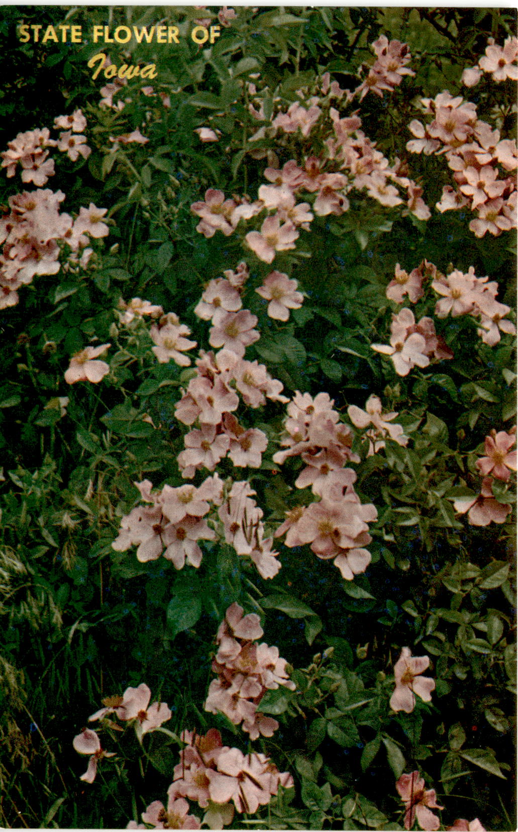 The front of the postcard mentions that the Wild Rose is the state flower of Iowa. The postcard also includes details about the photography, mentioning Es-n-Len Photos and Mike Roberts from Berkeley, California. The back of the postcard provides contact information for Es-n-Len Photos in Aurora, Illinois.