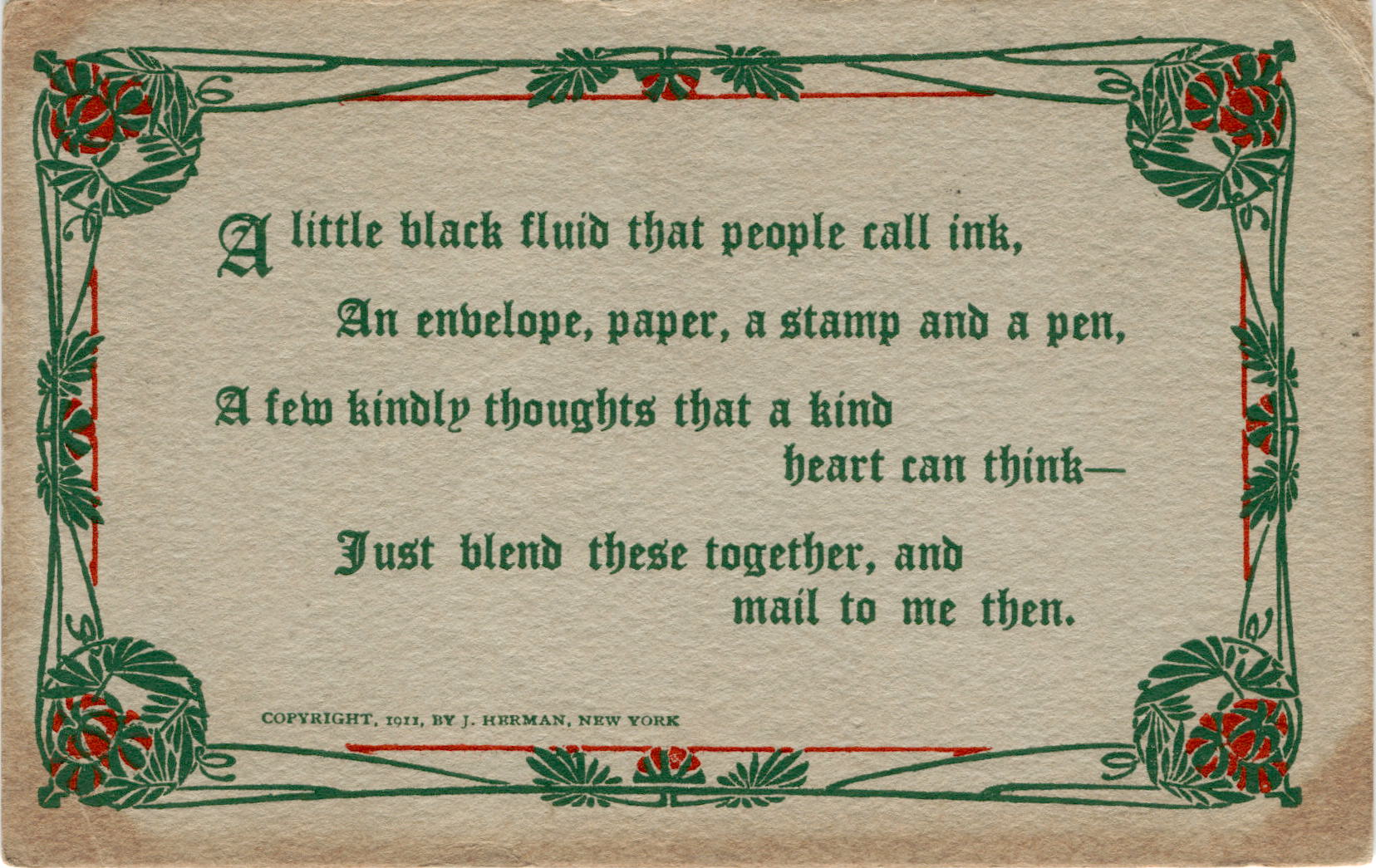This postcard features a poem about sending a message through mail, with a copyright from 1911 by J. Herman in New York. The front of the postcard includes instructions for correspondence and address details. The message on the back is addressed to DeAR-Nessie and expresses concern for not hearing from the recipient in over a week.