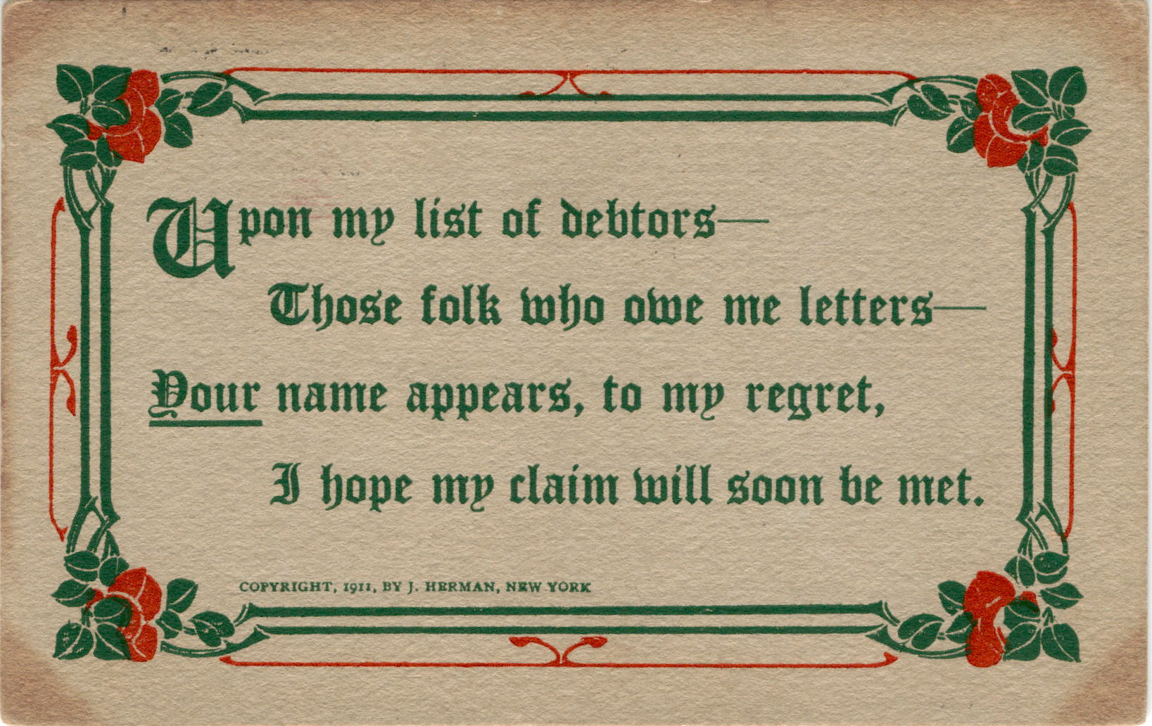 The postcard is a vintage one from 1911, featuring a poem and a message from a sender named Newhik Hicks from Red #3, Michigan. The poem on the front of the postcard humorously mentions debts of letters owed. The sender on the back expresses worry over not hearing from the recipient for five days, hoping they are well.