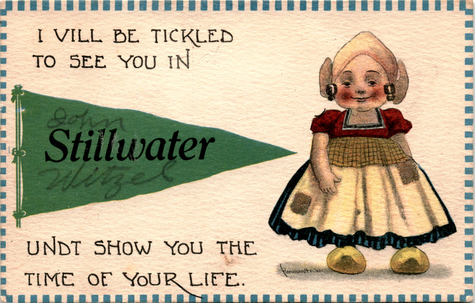 This postcard is an invitation to a dance at the home of Gulitzel in Stillwater, Wize. The event is scheduled for Saturday evening in February and is hosted by Walter Marty and Henry Moll. The invitation specifies that ladies should bring cake and that the recipient and their sister are invited to attend. The postcard also mentions John and Lake Elmo.